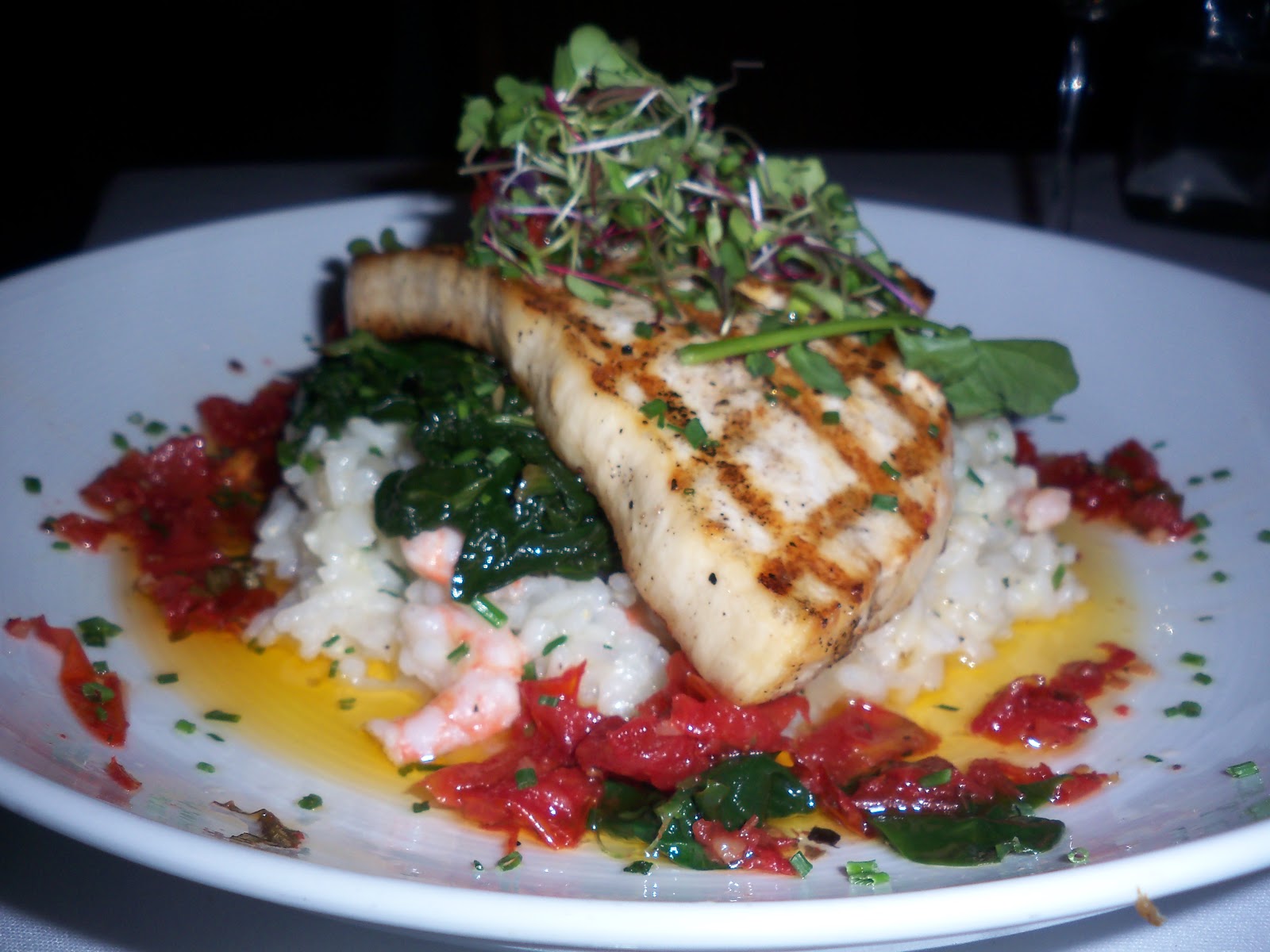 george's valentines day meal: swordfish over shrimp risotto and wilted greens |